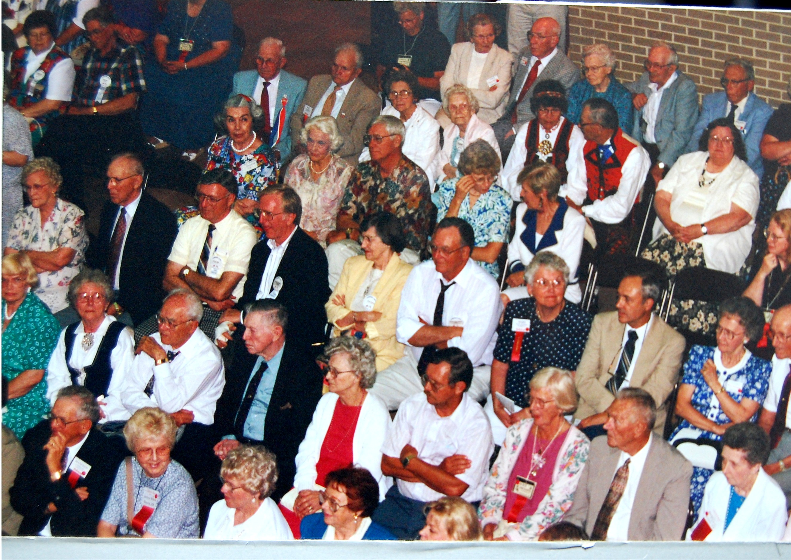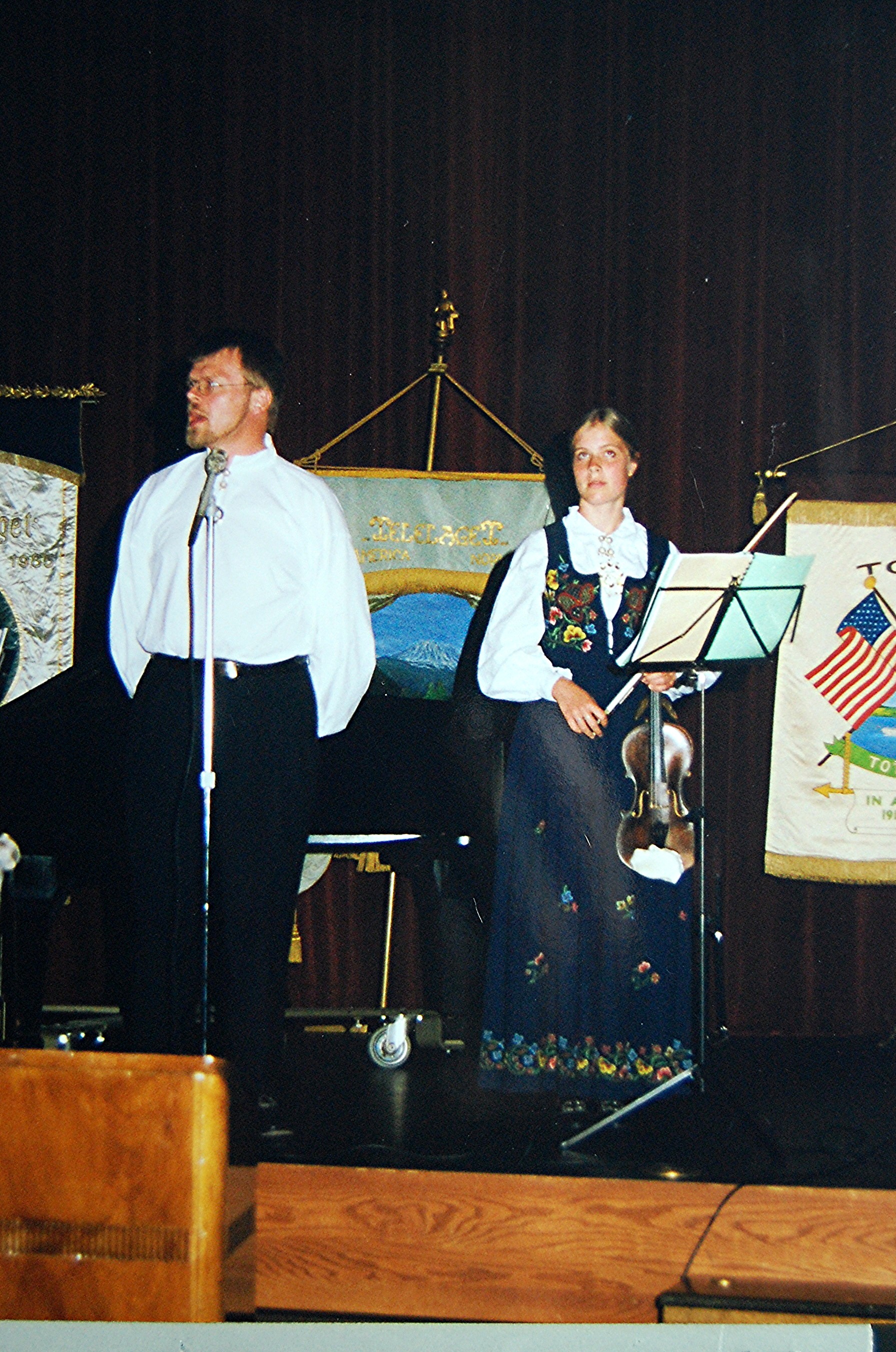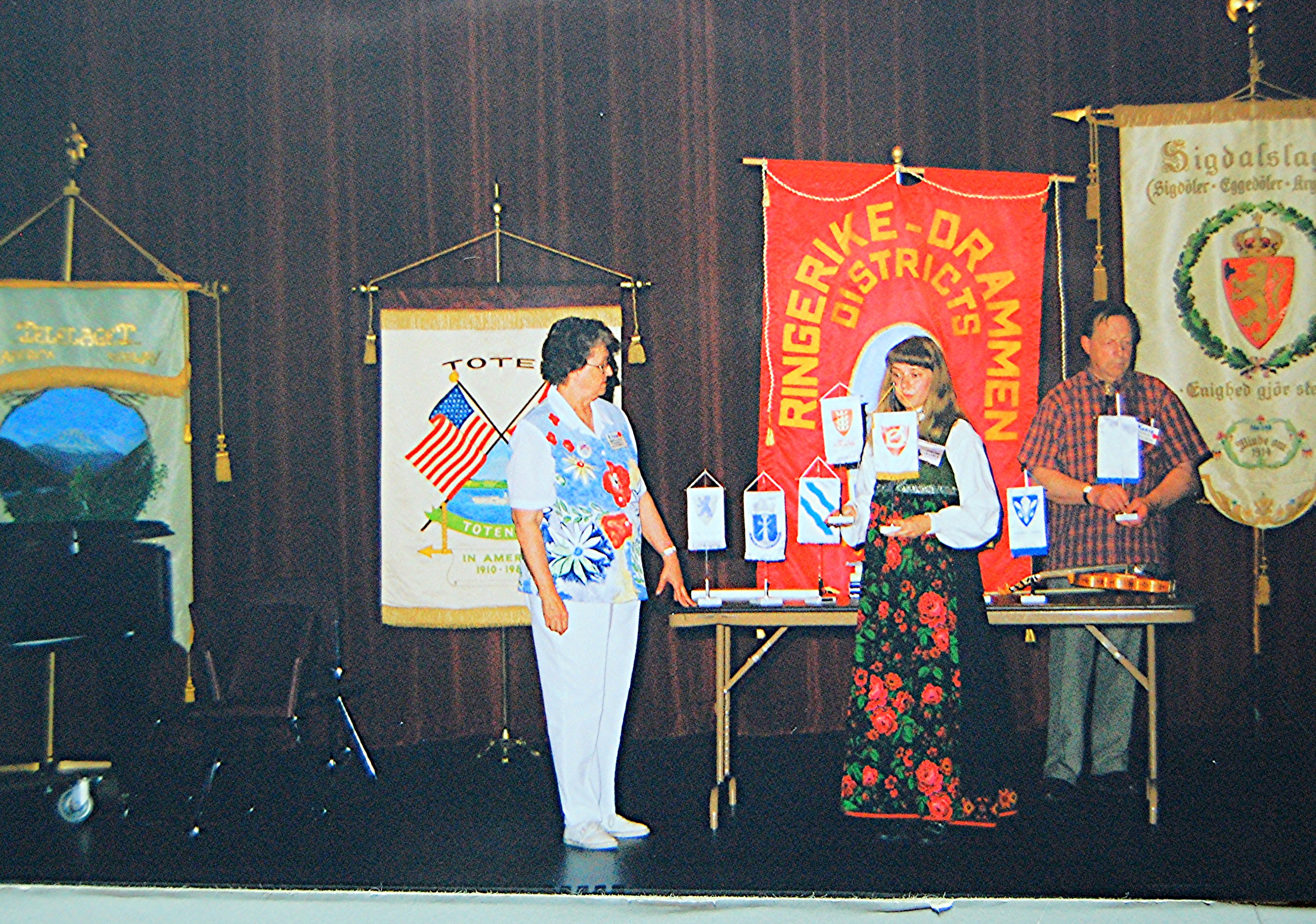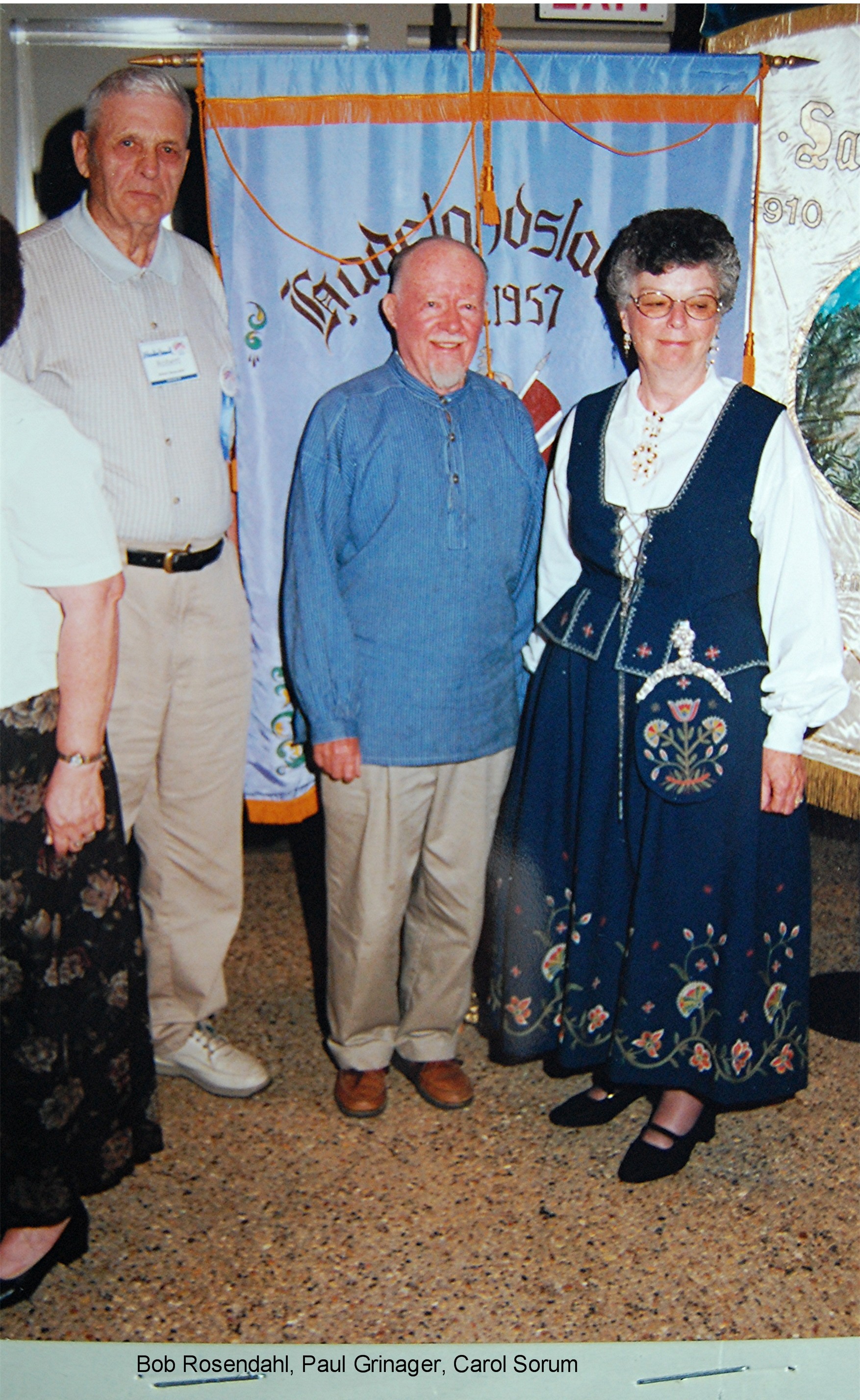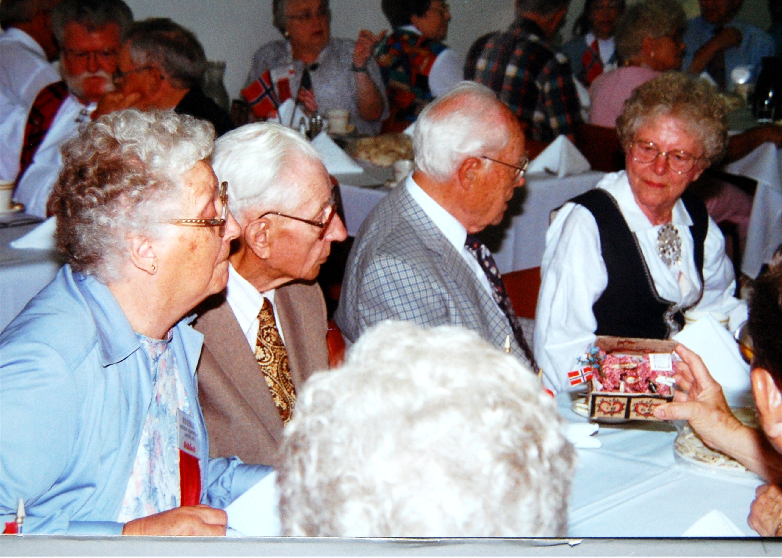 from Drammen, Buskerud, Norway.Many choices of seminar workshops were available during the day on Friday and that evening there was a parade of Bygdelags. The Hadeland Lag was represented by Paul Grinager, who carried the Hadeland banner, by our president, Bob Rosendahl, and Carol Sorum, wearing her newly-sewn Hadeland bunad. Saturday morning there were more workshops available and in the afternoon individual lags held their meetings. The Hadeland meeting followed a brief joint meeting with Landingslaget about the 2000 trip to Norway. The Bygdelag Centennial Banquet was held in the evening, and featured Christian Skjervold as Master of ceremonies; The Lost Norwegians from Northfield MN; the Luren Singing Society directed by Dr. David Judisch from Decorah; and the Foot-Notes, also from Decorah. Marilyn Sorensen and Chris Skjervold, Bygdelag Centennial Co-Chairs, closed the evening by saying adjø. From the August 1999 Brua |
