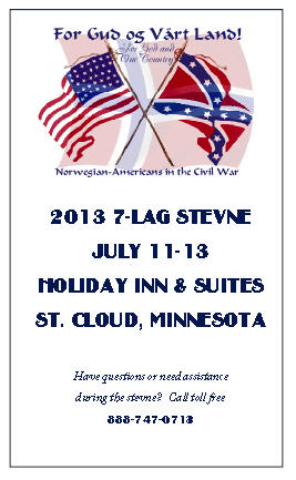 The Hadeland Lag was responsible for coordinating the 2013 stevne. The theme focused on the sesquicentennial of the Civil War and US-Dakota War of 1862. The battle cry "For Gud og Vårt Land!" in the logo was taken from the 15th Wisconsin (Scandinavian) Regiment's flag. Lag members and the general public brought attendance to over 400. A great time was had by all!